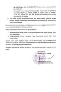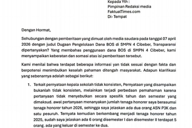Dalam surat somasi Bernomor 421.3/542/SMPN4Cbr/IV/2026, pihak sekolah menilai pemberitaan yang telah diterbitkan belum sepenuhnya berimbang dan tidak sesui serta dapat menyesatkan. Mereka juga meminta adanya perbaikan atau ralat terhadap isi berita.